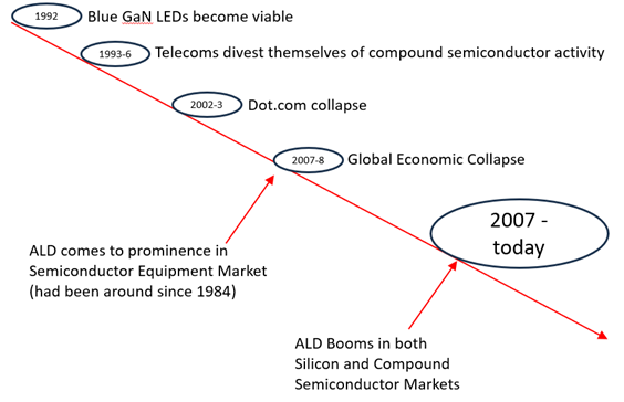Now move forward to 2002-2003 when the dot.com collapse occurred, it was basically a boom based on compound semiconductors used for optical transmission, newer companies like JD Uniphase and Nortel boomed for a while, software advances were limited at this stage so that compound semiconductors were needed again, but oversupply and overpromise created a bubble that burst. Then in 2007-2008 the Global Economic Collapse occurred, investors had already become more conservative because of the dot.com collapse but investment dried up after the Global Collapse (I’m totally ignoring the solar cell bubble, that’s a separate economic disaster related to over-investment, a separate area of semiconductors entirely). But here is where things get interesting, the recovery from 2008 was so long that governments also pealed back on scientific grants for many, many years. Compound semiconductor research was based on MOCVD and MBE systems worth close to a million (or several hundred thousand) dollars or more. Soon, after 2008, Aixtron and Veeco stopped offering systems of that size for MOCVD research because no one could afford them, MBE system providers struggled. A whole generation of PhD’s brought up on MOCVD and MBE film growth systems for compound semiconductors couldn’t get grants for those systems when they started their own groups, however atomic layer deposition (ALD) systems could do compound semiconductors and were very much more affordable, grants were available to buy those.